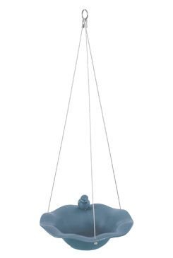 Karamická miska s dekorací ptáčka na okraji může sloužit jako pítko nebo koupel pro ptáky. Keramika je mrazuvzdorná a je opatřena pevnými kovovými lanky pro zavěšení. O misky 26cm.