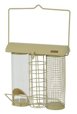 Závěsné venkovní kovové krmítko se stříškou a 3 samostatnými komorami na mix semen, lojové koule a slunečnicová semínka.