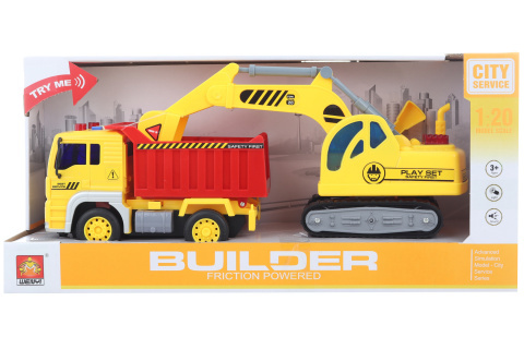 Bagr a sklápěčka na baterie. Po stisknutí tlačítek sklápěčka vydává zvuky a svítí. Rozměry sklápěčky cca 17,5 x 9 x 8 cm. Rozměry balení cca 39,5 x 18,5 x 12 cm. Napájení na 3 AG13 (jsou součástí balení). Věk 3+ prečítať celé