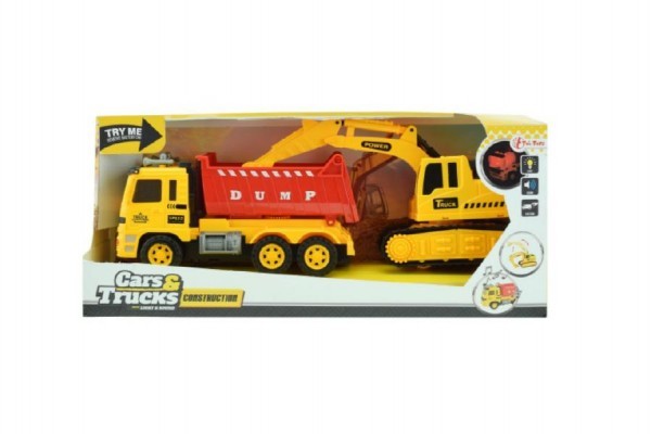 Auto sklápěč + bagr 2ks plast na baterie se světlem se zvukem na setrvačník v krabici 36x16x11cm