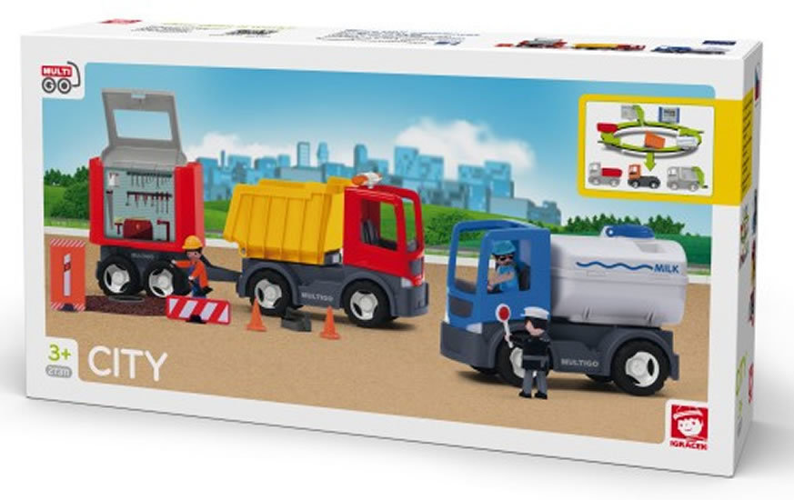 Ekonomicky výhodné velké balení pro každého rodiče zvažujícího nákup dvou aut řady Igráček MultiGO. Sada obsahuje červené a modré auto s majáky, z korbiček cisternu na mléko, sklápěčku a multikorbičku hasiči / mechanici. Součástí jsou také tři Igráčci vč prečítať celé