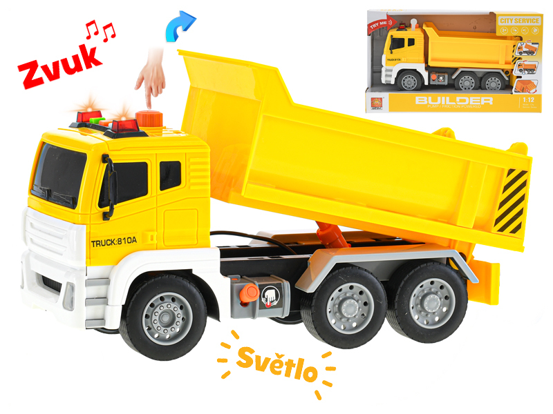 Auto sklápěčka 28cm 1:12 na setrvačník na baterie se světlem a zvukem v krabičce