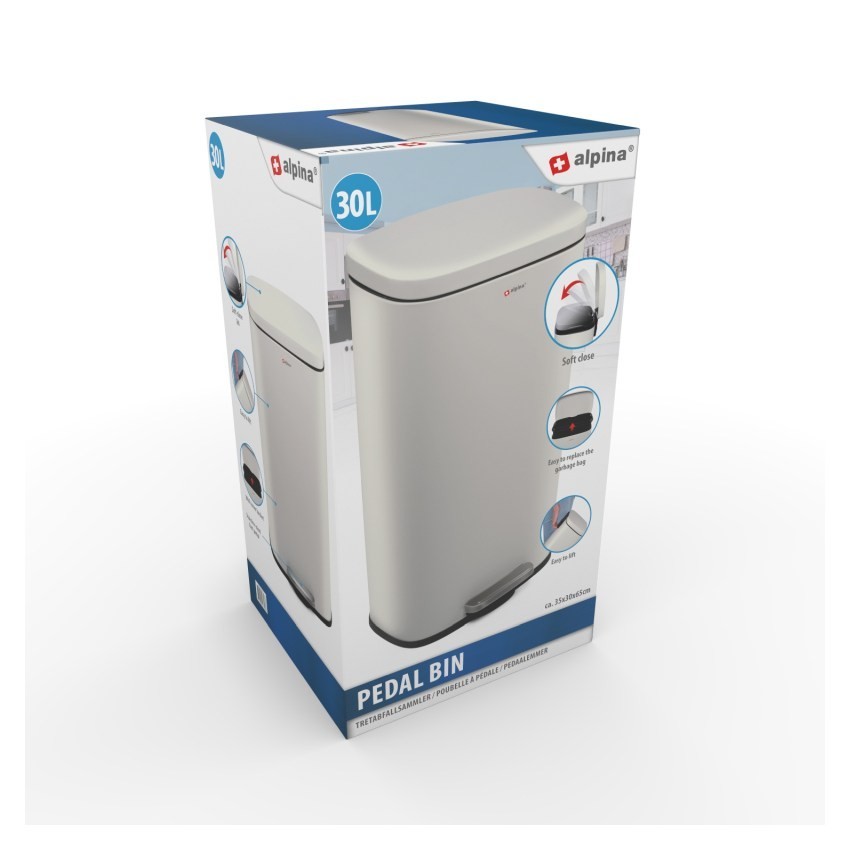 Ať už v koupelně nebo v kuchyni tento odpadkový koš se díky svému jednoduchému, ale elegantnímu designu skvěle hodí do každé místnosti. Má kapacitu cca 30 litrů. Plastová vložka usnadňuje vyprazdňování a čištění kbelíku. Nožní pedál umožňuje otevřít koš bez námahy, aniž byste se museli ohýbat. Mechanismus měkkého zavírání zabraňuje hlasitému bouchnutí. Rozměry: 35x30x63,5cm