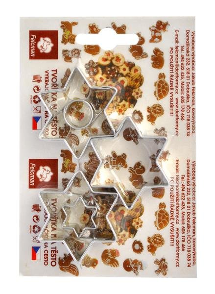 Sada vykrajovátek 3 ks - tvar hvězdičky. Vhodné na cukroví, perníčky, potahové nebo modelovací hmoty. Vykrajovátka jsou od českého výrobce a splňují všechny předepsané normy, vyrobeno z pocínovaného plechu. Obsah balení: 1x hvězdička plná, 1x hvězdička s kulatým středem, 1x hvězdička s hvězdičkovým středem. Průměr - 4 cm.
