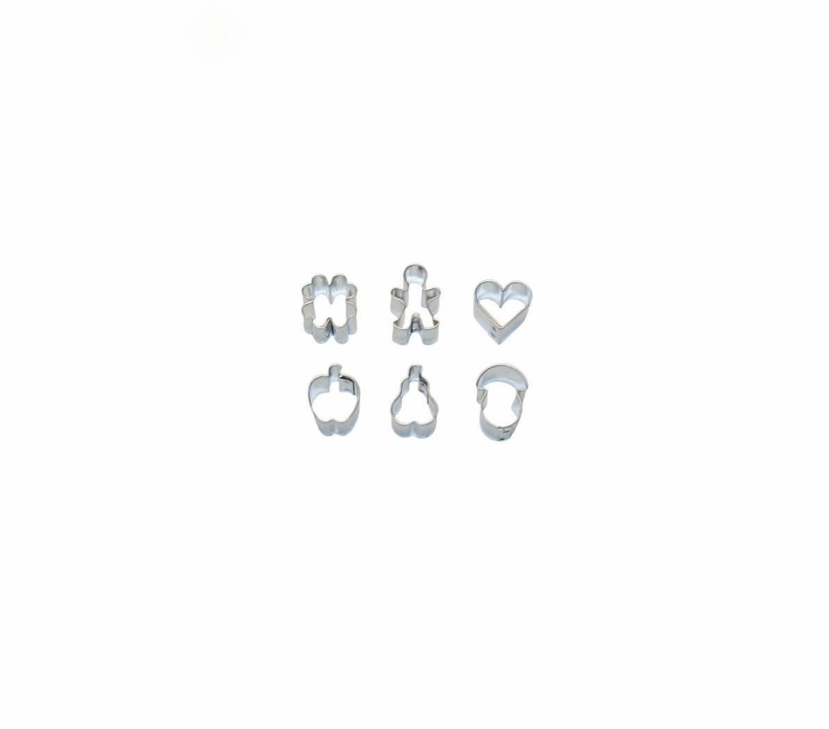 Sada 6ti mini vykrajovátek (hříbek, panáček, srdce, čtyřlístek, hruška, jablko) z pocínovaného plechu. prečítať celé