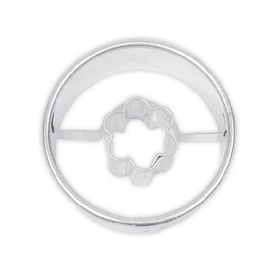 Vykrajovátko na cukroví ve tvaru kolečka průměrem 4 cm a květem uprostřed. prečítať celé