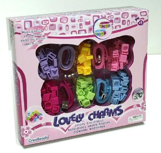přívěšky, plastové náramky k navlékání.Barvy: fialová, žlutá,