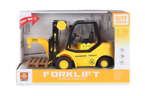 Plastová zdvižka na baterie 3 x AG13 (jsou součástí balení). Po stisknutí tlačítek zdvižka svítí a vydává zvuky. Rovněž má pohyblivou přední část a lze s ní zvihat přiloženou paletu. Rozměry zdvižky cca 23 x 12,5 cm. Rozměry balení cca 29 x 18,5 x 11,5 xm. Věk 3+ prečítať celé