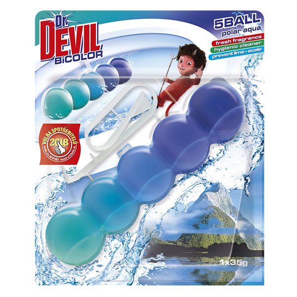 Dr. Devil BiColor - kuličkový gelový závěs do WC - 35gr vůně Polar Aqua5 Ball BiColor je závěs do toalety ze speciálního gelu, který čistí, voní a preventivně působí proti usazování voního kamene. Aplikace je velmi jednoduchá a zvládne ji opravdu každý. Stačí odstranit z nového závěsu folii a...