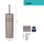 Uzavřená toaletní souprava Leo je vyrobena z kovu s práškovým nástřikem a zdobená perforovaným vzorem po celém obvodu. Rukojeť toaletní štětky je z nerezové oceli a lze ji v případě potřeby vyměnit stejně jako hlavici štětky. Vnitřní plastová nádoba zachycuje odkapávající vodu a lze ji snadno vyjmout pro vyprázdnění a čištění.