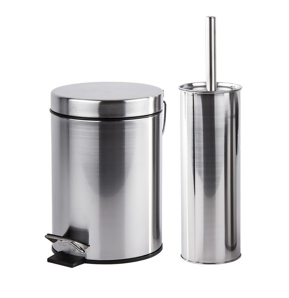 Elegantní a praktická sada pro vaši koupelnu. Obsahuje pedálový odpadkový koš a WC štětku s držákem, oba vyrobené z kartáčované nerezové oceli. Moderní design se hodí do každého interiéru a zajišťuje dlouhou životnost.