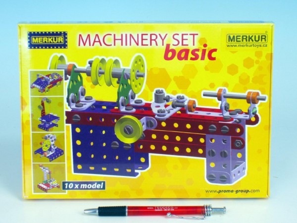 MERKUR Machinery set basic je stavebnice zaměřená na stavbu obráběcích strojů jako je soustruh, pásová pila, kotoučová pila atd ... Lze z ní ale sestavit i auto, lanovku a mnoho dalších modelů z vlastní fantazie. Součástí balení je návodová knížka a montážní nářadí.