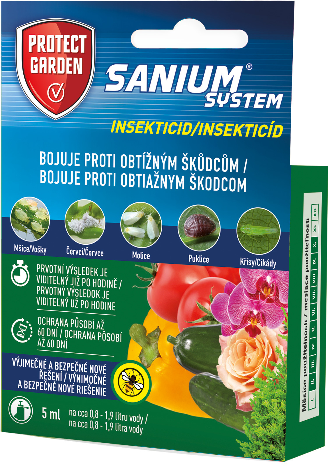 Účinná látka: flupyradifuron (25 g)NEŠKODNÝ PRO VČELY! Popis:Působí systémově na savé žravé škůdce. Vhodný například na pilatku švestkovou.Pracuje systémově i kontaktně.Sanium® System je insekticidní přípravek určený k ochraně okrasných rostlin, salátu, rajčat, okurek, papriky, baklažánu, cukety,...