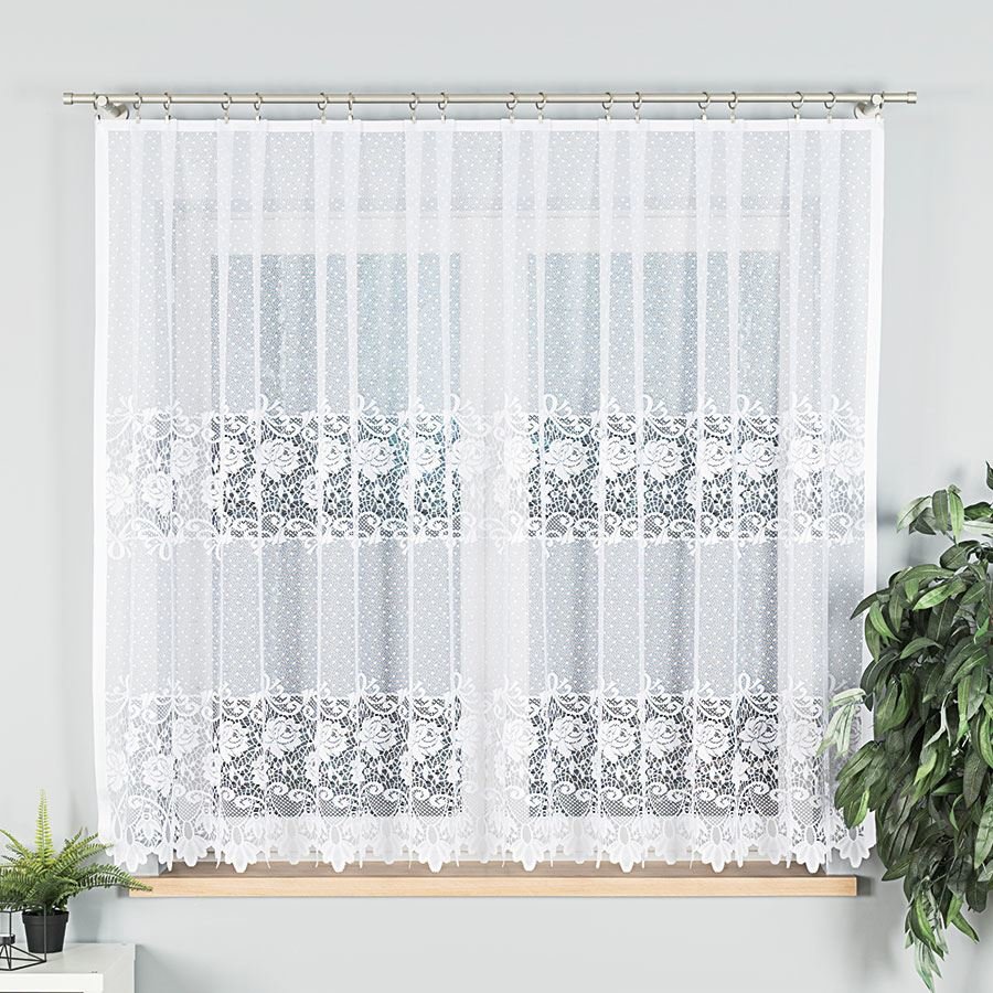 Kvalitní krátká hotová dekorační záclona v moderním provedení a stylu do ložnice nebo obývacího pokoje o rozměru 300x160 cm. Záclona je připravena na zavěšení na žabky. 1 kus v balení.