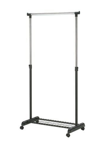 Stojan na kolečkách s nastavitelnou výškou 107 až 160 cm. Stojan na šaty JAMES 168 cm s roštem na odkládání bot je praktickým pomocníkem do každé šatny. Snadná manipulace.