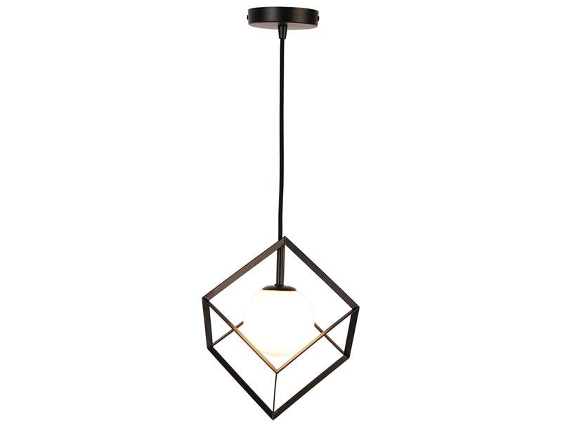 Svítidlo inspirované industriálním stylem ve tvaru krychle, vyrobené z kovu v černo-zlaté barvě, s bílým skleněným stínidlem uvnitř. Ideální do obývacího pokoje, kuchyně, jídelny, kanceláře, ložnice, pokoje pro mládež.