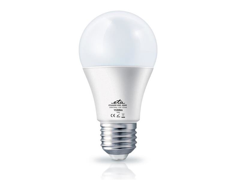 EKO LEDka (ETAA65W15NW) je mléčná 15W LED žárovka s paticí E27 a vstupním napětí 230V. Světelný tok žárovky je 1530 Lm s úhlem svítivosti 220°. Její světlo řadíme mezi neutrální bílé (o síle 4000K) a je alternativou klasické 100W žárovky. Rozměry žárovky jsou 65x132 mm.