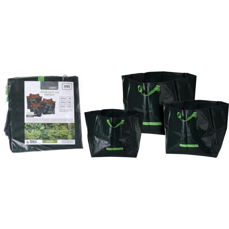 zahradní taška, materiál pe 200 gsm, sada 3ks: velikost 1/70 litrů: 42x42x40cm, velikost 2/105 litrů: 48x48x46cm, velikost 3/175 litrů: 56x56x56cm, tmavě zelená barva. prečítať celé