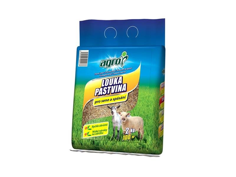Směs travní AGRO LOUKA A PASTVINA 2 kg AGRO Travní směs LOUKA je určena pro zatravňování extenzivně pečovaných travních ploch a pro zakládání víceletých lučních porostů, které jsou vhodné především pro produkci sena a pro spásání zvířaty. Obsahuje chutné druhy trav...