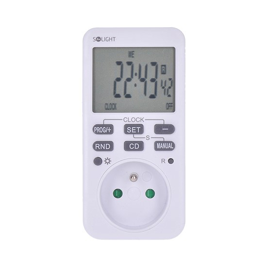Spínací zásuvka SOLIGHT DT33 digitální týdenní Spínací zásuvka SOLIGHT DT33 Technické parametry:- přehledný, velký a podsvícený LCD displej- LED indikátor zapnutí- automatický nebo manuální režim- 10 spínacích cyklů s rozlišením 1 minuta- 16 kombinací dní nebo skupin dní-...