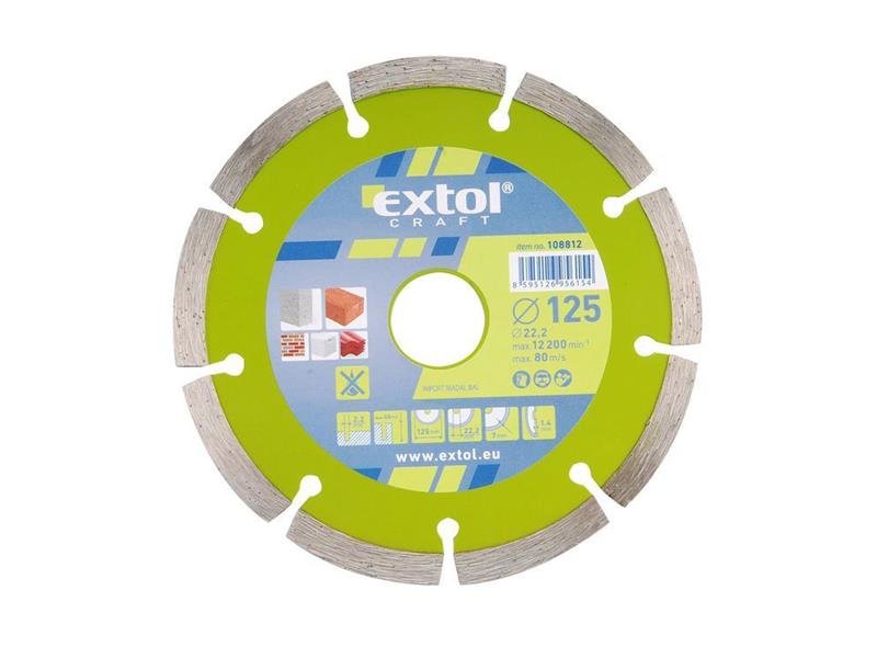 Kotouč diamantový řezný segmentový 115mm EXTOL CRAFT 108811 Kvalitní řada diamantových řezných kotoučů pro neprofesionály a domácí kutily za příznivou cenu. Určeno pro suché řezání stavebních materiálů v domácnosti, dílně a na stavbě.Technické parametry:- rozměry: 115 x...