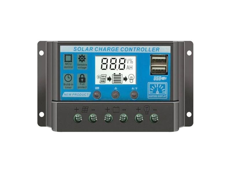 Solární regulátor PWM KLX3230 12V/30A+USB pro různé typy baterií. Umožňuje nabíjení baterií Pb, Li-Ion nebo LiFePO4 proudem až 30A a připojení FV panelů 18V (pro systémové napětí 12V) do výkonu 360W. Je vybaven LCD displejem pro nastavení a zobrazení provozních parametrů.