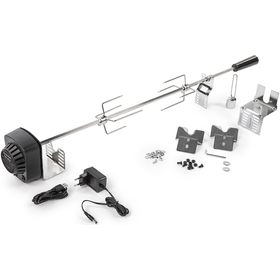 Tento set obsahuje grilovaciu ihlu s motorom, ktorá uľahčí rovnomerné otáčanie mäsa počas grilovania. Motor je napájaný klasickým napätím 230 V pri frekvencii 50/60 Hz, čo zabezpečuje spoľahlivý a rovnomerný chod. Ihla má dĺžku 80 cm, čo jej umožňuje držať väčšie kusy mäsa, celé kurčatá alebo jahňacie. Vďaka materiálu z nerezovej ocele je príslušenstvo odolné voči korózii a ľahko udržateľné.