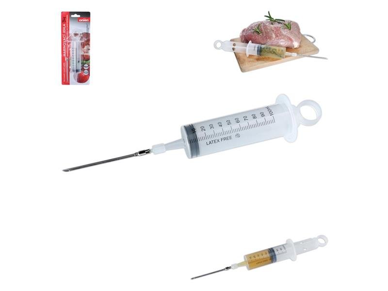 Pístový dávkovač je skvělý pro marinování - nakládání všech druhů mas, zejména větších kusů. Dutá jehla umožňuje marinování olejem včetně koření - díky silné jehle projde i hrubší koření a hustší marinády. Materiál: plast PP, jehla - nerez. Rozměr: zásobník - objem 0,1 l, d. 20 cm, pr. 3,5 cm, jehla d. 9,5 cm, pr. 0,3 cm. Dávkovač můžete použít také na plnění koblih marmeládou, trubiček krémem.