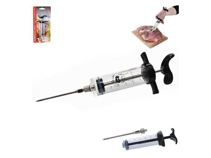 Pístový dávkovač je skvělý pro marinování - nakládání všech druhů mas, zejména větších kusů. Dutá jehla umožňuje marinování olejem včetně koření. Materiál: plast PMMA, PP, jehla - kov. Rozměry: zásobník - objem 0,03 l, d. 14 cm, pr. 2,5 cm, jehla 8 cm. prečítať celé