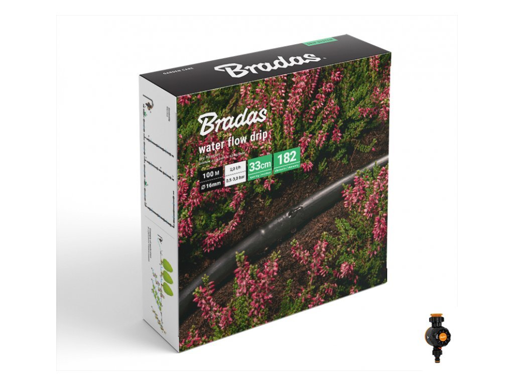 Zavlažovací sada, kapací hadice Water Flow Drip ø16mm 100m, 182ks příslušenství a zavlažovací hodiny BRADASZavlažovací sada s nadzemní kapací hadicí Water Flow Drip o průměru 16 mm, v délce 100 m, 182 ks příslušenství a mechanickými zavlažovacími hodinami pro účinné zavlažování velkých ploch a...