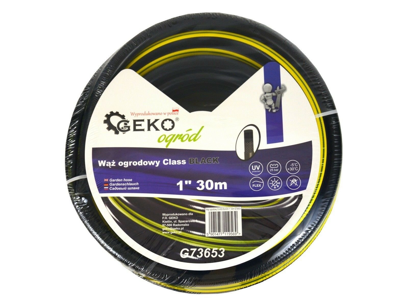 Hadice zahradní černá 1", 30 m, GEKOKvalitní zahradní hadice GEKO s ochranou proti UV záření se vyznačuje vysokou flexibilitou, odolností vůči povětrnostním vlivům, odolností proti mechanickému poškození díky 3vrstvé struktuře a její vnitřní část je odolná proti tvorbě a zachytávání řas. Výztuž...