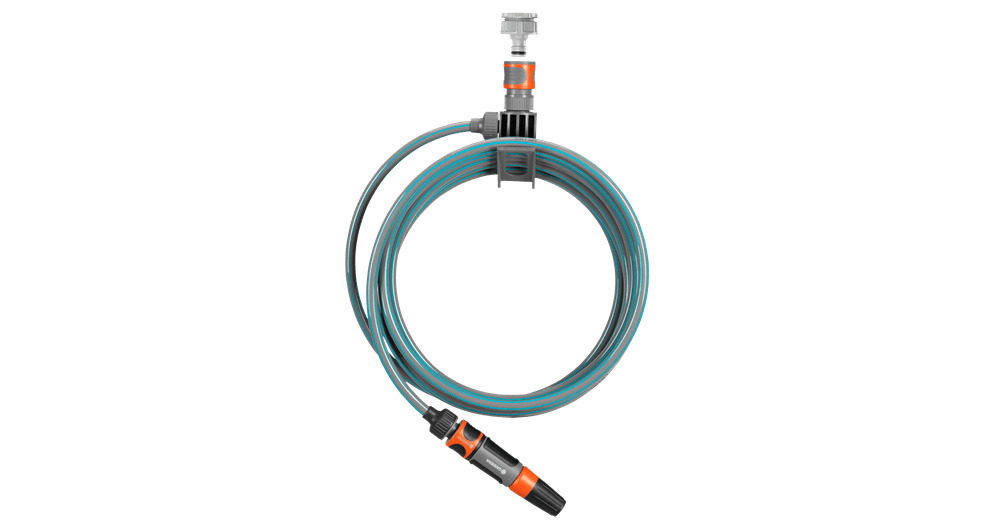 GARDENA spirálová hadice je nabízena jako praktická kompletní sada se šroubením na vodovodní kohoutek a postřikovačem.