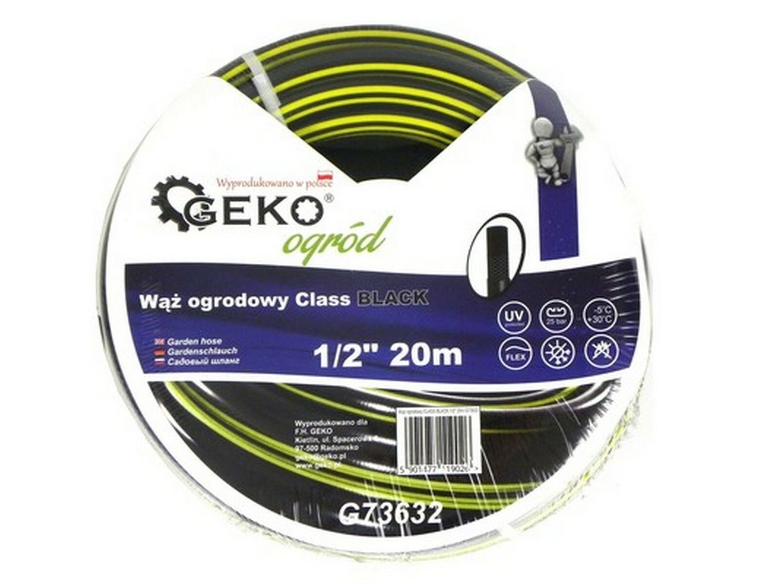 Hadice zahradní černá 1/2", 20 m, GEKOKvalitní zahradní hadice GEKO s ochranou proti UV záření se vyznačuje vysokou flexibilitou, odolností vůči povětrnostním vlivům, odolností proti mechanickému poškození díky 3vrstvé struktuře a její vnitřní část je odolná proti tvorbě a zachytávání řas. Výztuž...