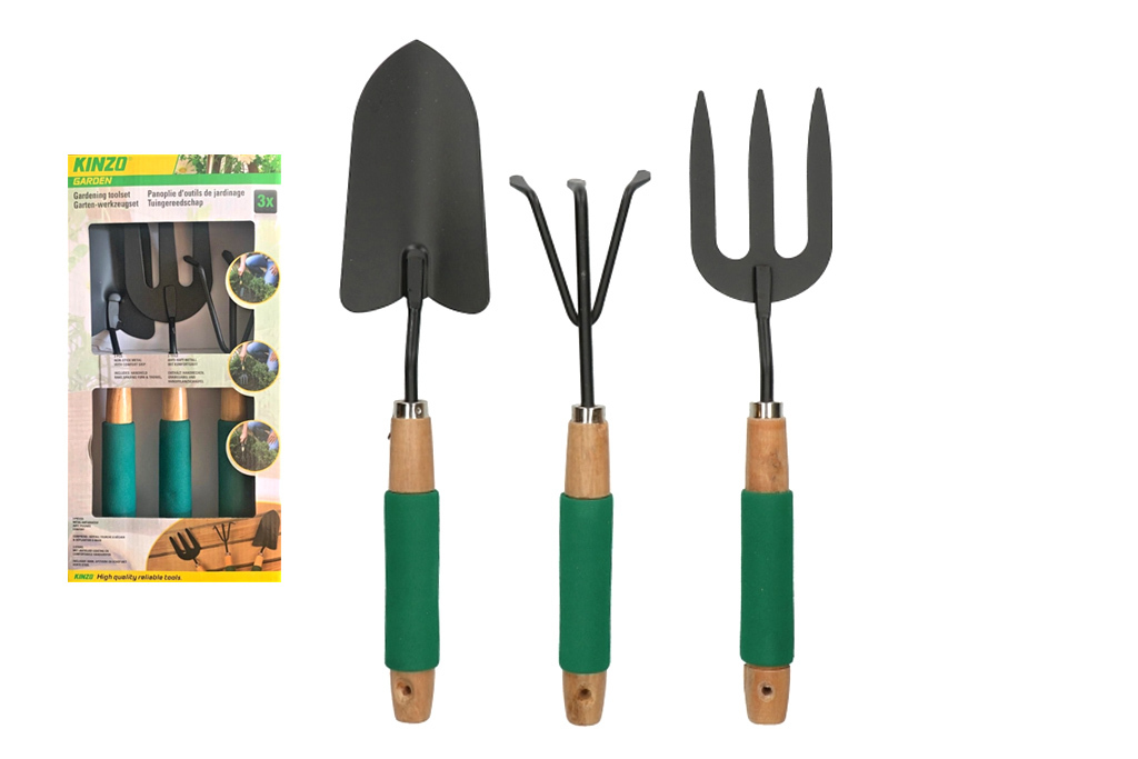 3 dílná zahradnická sada - ruční hrábě, rycí vidle, ruční lopata - kov se dřevem - měkká rukojeť