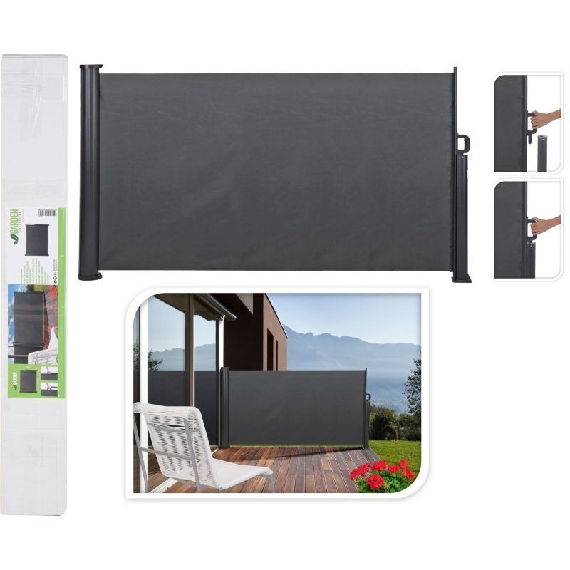 WINDSCREEN FOR TERRACE. SIZE 3X1.4 METER, ALUMINIUM HOUSING AND 220 GRAM/M2 POLYESTER CLOTH 290X130MM WITH PA COATING, ALU ROLLER DIA 35MM, ALU TOP SIZE: 105X88MM ALU BODY SIZE: 100X83MM, WARNING: POLE MUST BE STRAIGHT. EACH IN WHITE BOX WITH 2 COLOR LABELS, 1 ON THE LONG SIDE AND 1 ON EACH SMALL SIDE, COLORS: ALUMINIUM AND CLOTH IN CHARCOAL/ 185X105X1.450MM, White box w/colour label: , 3.000X3.000X1.400MM / CFT 1,00,(2.400/40ft HQ)