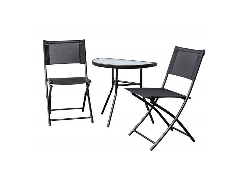3dílný kovový balkónový set obsahuje: 1 x půlkruhový stůl s prosklenou vrchní deskou o rozměru 70 x 40 x 63 cm a 2 x skládací židle s textilenovým výpletem 2x1 o rozměru 55 x 45,5 x 78 cm.