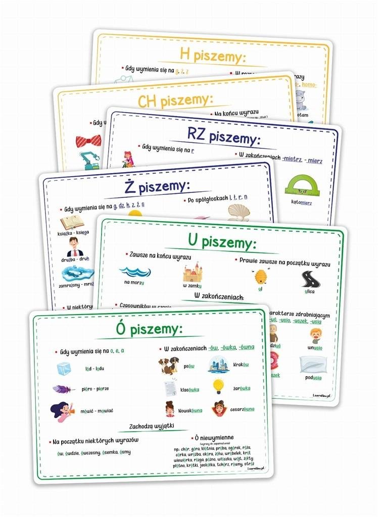 Zestaw zawiera 6 kart w formacie A4.Plansze wyjaśniające zasady ortografii razem z przykładami.Zawierają litery takie jak: ó-u, ż-rz, ch-h.Duży rozmiar idealnie nadaje się do powieszenia w sali.Cechy produktu: Duży, czytelny format A4(297mm x 210mm) Drukowane na papierze 200g Dwustronnie...