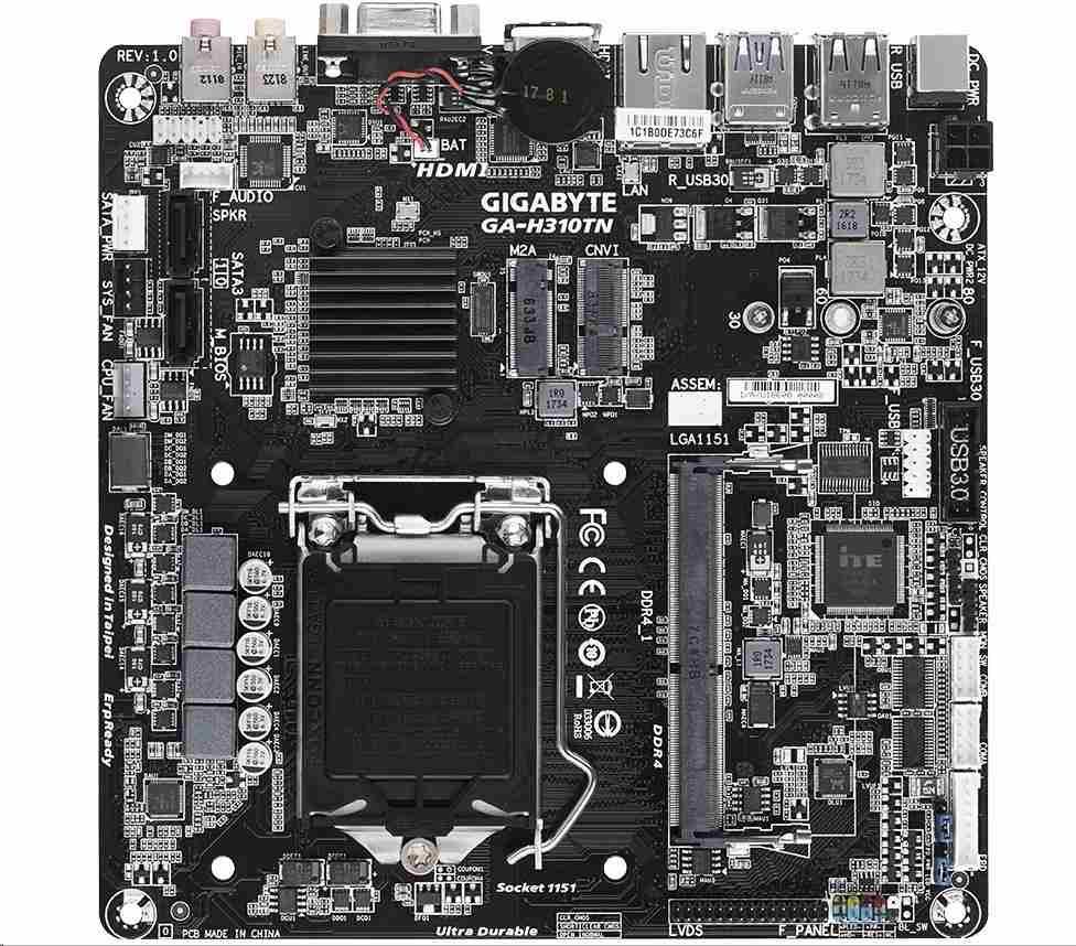 GA-H310TN (rev. 1.0)Socket LGA1151 for Intel Core i7/i5/i3/Pentium/Celeron (Coffee lake-S)Intel Gen10 Intel Graphics DX 11/12, OGL4.3/4.4Supports Single Channel DDR4 2133/2400MHz, 1 x SO-DIMM, up to 16GB system memory1 x HDMI, 1 x VGA, 1 x Dual Channel 24-bit LVDS4 x USB 3.0, 4 x USB 2.0, 2 x...