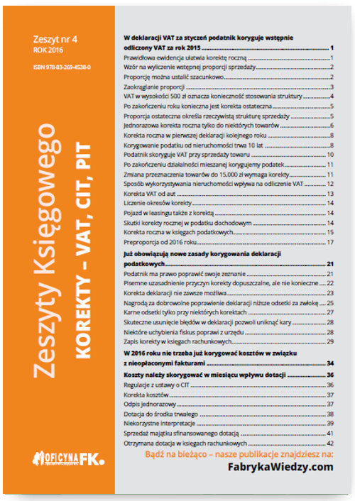 Opracowanie zawiera informacje na temat obowiązujących od 1 stycznia 2016 r. przepisów w zakresie korekt deklaracji podatkowych. Omawia również jak bezbłędnie sporządzić roczną korektę VAT, prezentuje liczne przykłady i wzór korekty na formularzu VAT - 7. Dodatkowo omawia korektę kosztów...