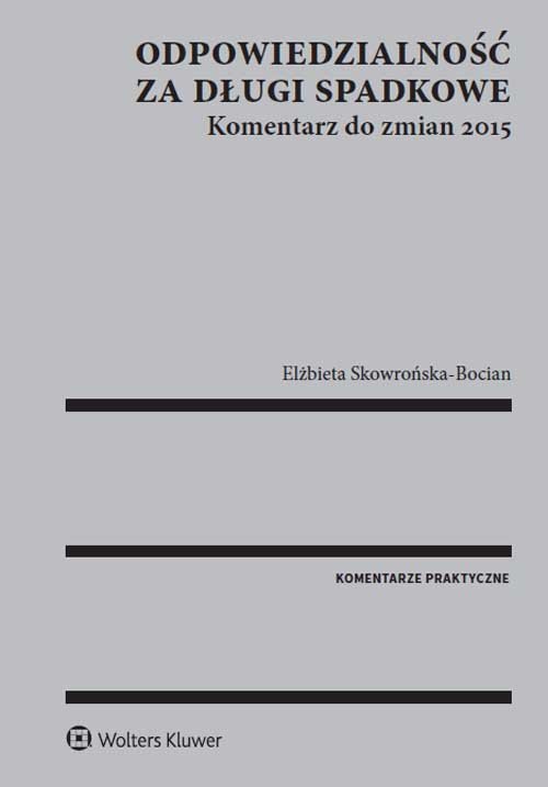 Oddajemy w ręce Czytelnika publikację, która zawiera omówienie problematyki odpowiedzialności za długi spadkowe oraz analizę zmian wprowadzonych ustawą z 20 marca 2015 r. o zmianie ustawy - Kodeks cywilny oraz niektórych innych ustaw (Dz. U. poz. 539).