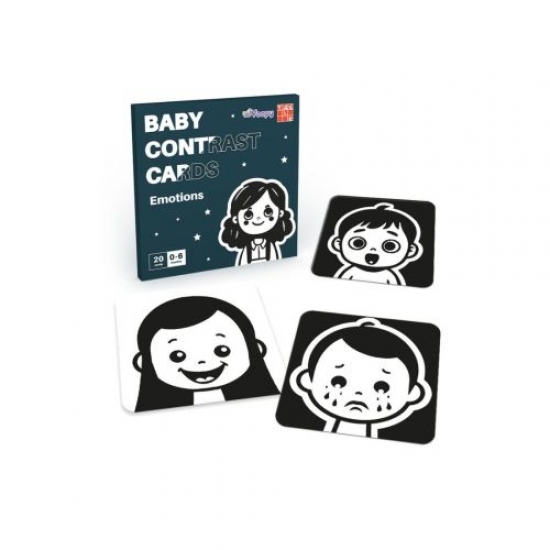 Kontrastné čierno-bielo kartičky Emócie pomáhajú pri rozvoji zraku bábätiek prostredníctvom jednoduchých obrázkov. Kartičky napomáhajú pri upokojovaní, budujú schopnosť koncentrácie a prebúdzajú prirodzenú detskú zvedavosť. Sada obsahuje 40 obrázkov na 20 kartičkách. Sú vyrobené z odolného a ekologického papiera.