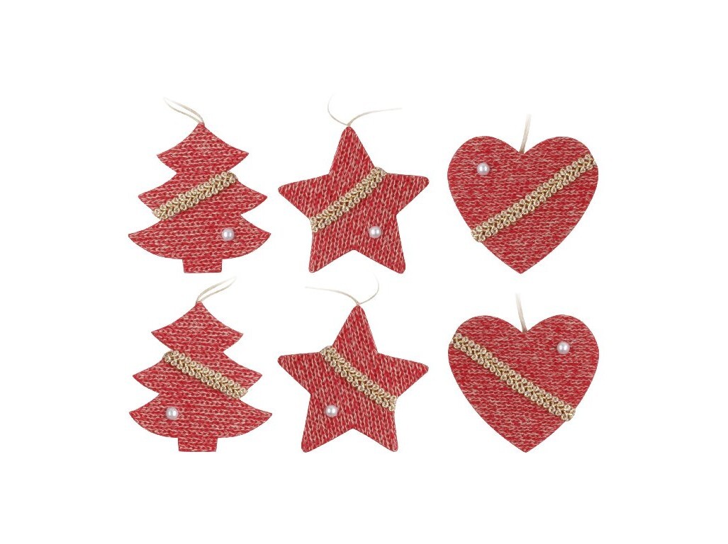 Závěs 6 ks, 60 mm srdce, hvězda, stromek, mix pletený červený