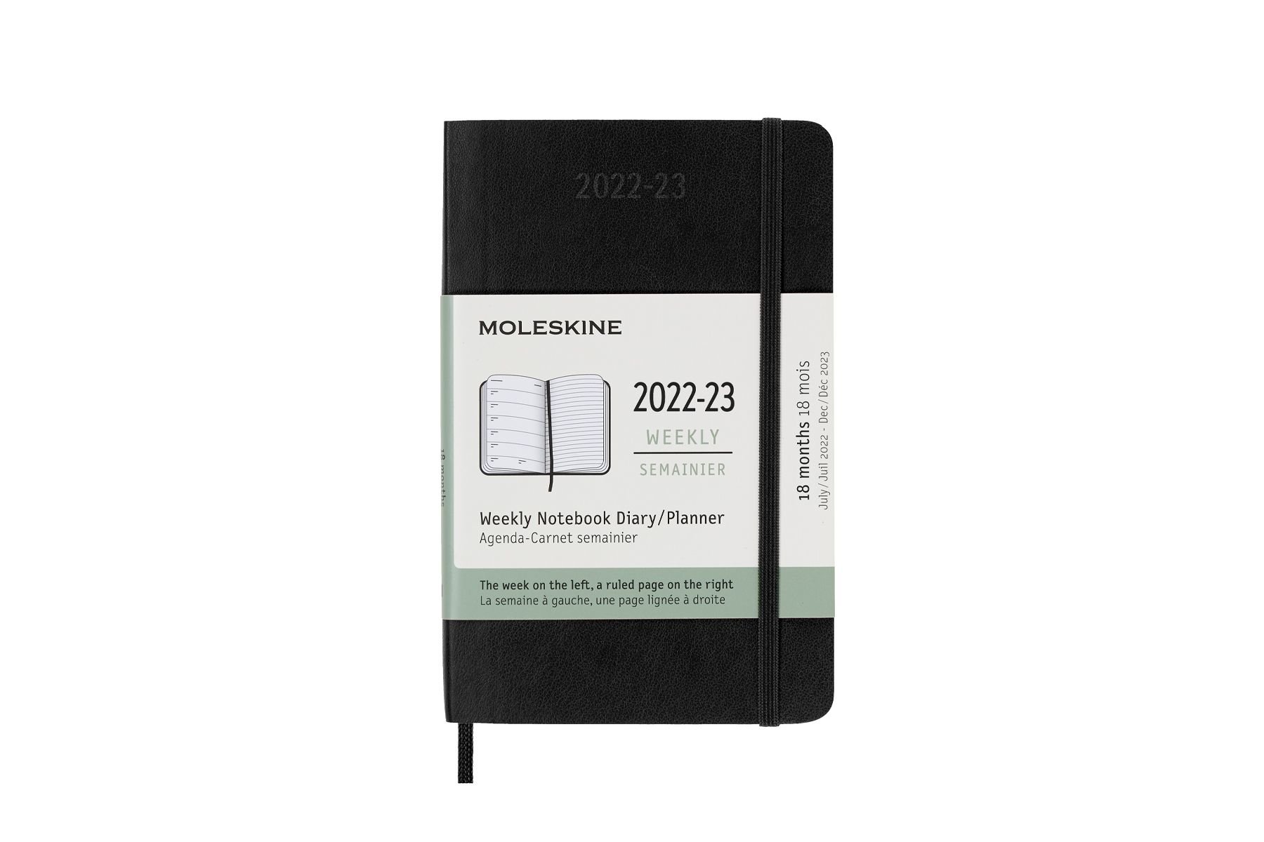 Černý plánovací zápisník kapesní velikosti na rok 2022-23. Diář je datovaný od července 2022 do konce roku 2023. Na levé straně jsou dny v týdnu a na pravé linkovaná stránka na poznámky. Diář má měkkou vazbu v kartonových deskách. Obepíná ho pružná páska proti samovolnému otevírání. Obsahuje praktickou vnitřní kapsu, textilní záložku a barevné samolepky. Papír s gramáží 70 g/m2 neobsahuje kyseliny.