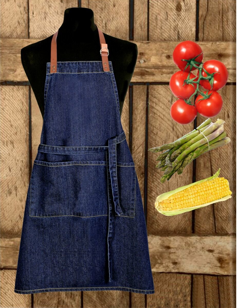 Moderní zástěra z pravého Denimu a stahovacího pruhu z eco kůže je velice vkusným a zároveň praktickým doplňkem v kuchyni nebo při grilování.