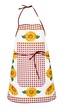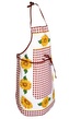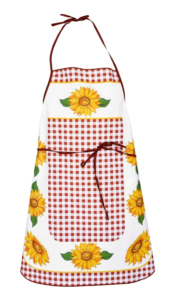 Praktická zástěra v dekoru slunečnic a kára působí příjemným, veselým dojmem.