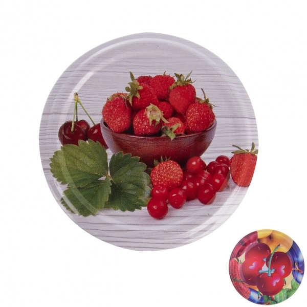 Víčko na zavařovací sklenici, se závitem. Materiál: kov. Dekor ovoce. Rozměry: pr. 66 mm. prečítať celé