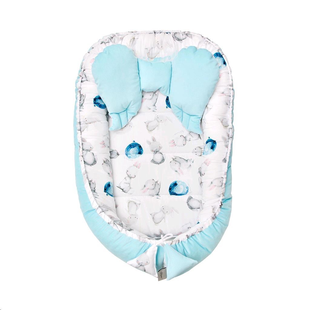 Hnízdo pro miminka Velvet Králičci Belisima. Navozuje miminkům pocit bezpečí, kopíruje tvar mámina těla a děťátko se tak cítí spokojeně jako u maminky v bříšku. Součástí hnízda je i stabilizační polštářek. Složení: 100% bavlna, spodní část 100% polyester, výplň: 100% polyester. Rozměry: cca 55x75 cm, vnitřní rozměry: cca 35x59 cm.
