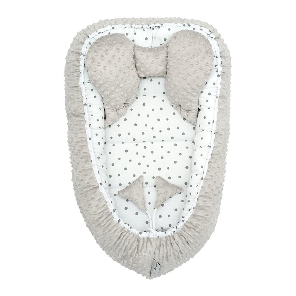 Hnízdo pro miminka Belisima dots. Navozuje miminkům pocit bezpečí, kopíruje tvar mámina těla a děťátko se tak cítí spokojeně jako u maminky v bříšku. Součástí hnízda je i stabilizační polštářek. Miminku se daleko lépe usíná a je klidnější. Složení: 100% bavlna, spodní část minky 100% polyester-minky, výplň: 100% polyester. Rozměry: cca 55x75 cm, vnitřní rozměry: cca 35x59 cm.