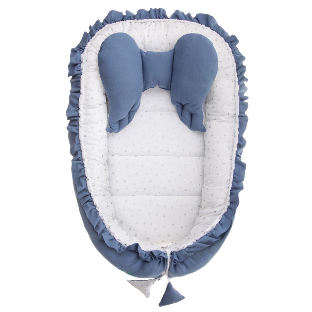 Hnízdo pro miminka Belisima Angel Baby. Navozuje miminkům pocit bezpečí, kopíruje tvar mámina těla a děťátko se tak cítí spokojeně jako u maminky v bříšku. Součástí hnízda je i stabilizační polštářek. Složení: 100% bavlna, výplň: 100% polyester. Rozměry: cca 55x75 cm, vnitřní rozměry: cca 35x59 cm.