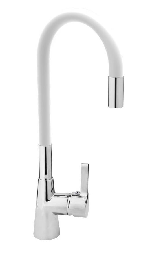 Dřezová baterie z mosazi s jedinečnou konstrukcí s ohebnou hadicí.